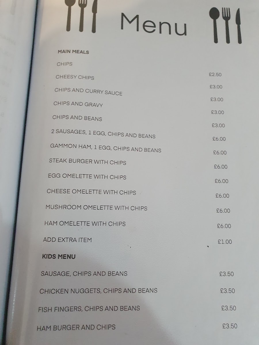 Main Meals cover a range of hearty dishes and sides. This section includes various chip combinations (plain, cheesy, with curry sauce, gravy, or beans), as well as plated meals such as sausages with eggs and beans, gammon ham with egg and beans, steak burgers with chips, and several omelette varieties served with chips.